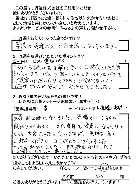 今回は、貸切バスをご利用になったS・Aさまより口コミをいただきました!!